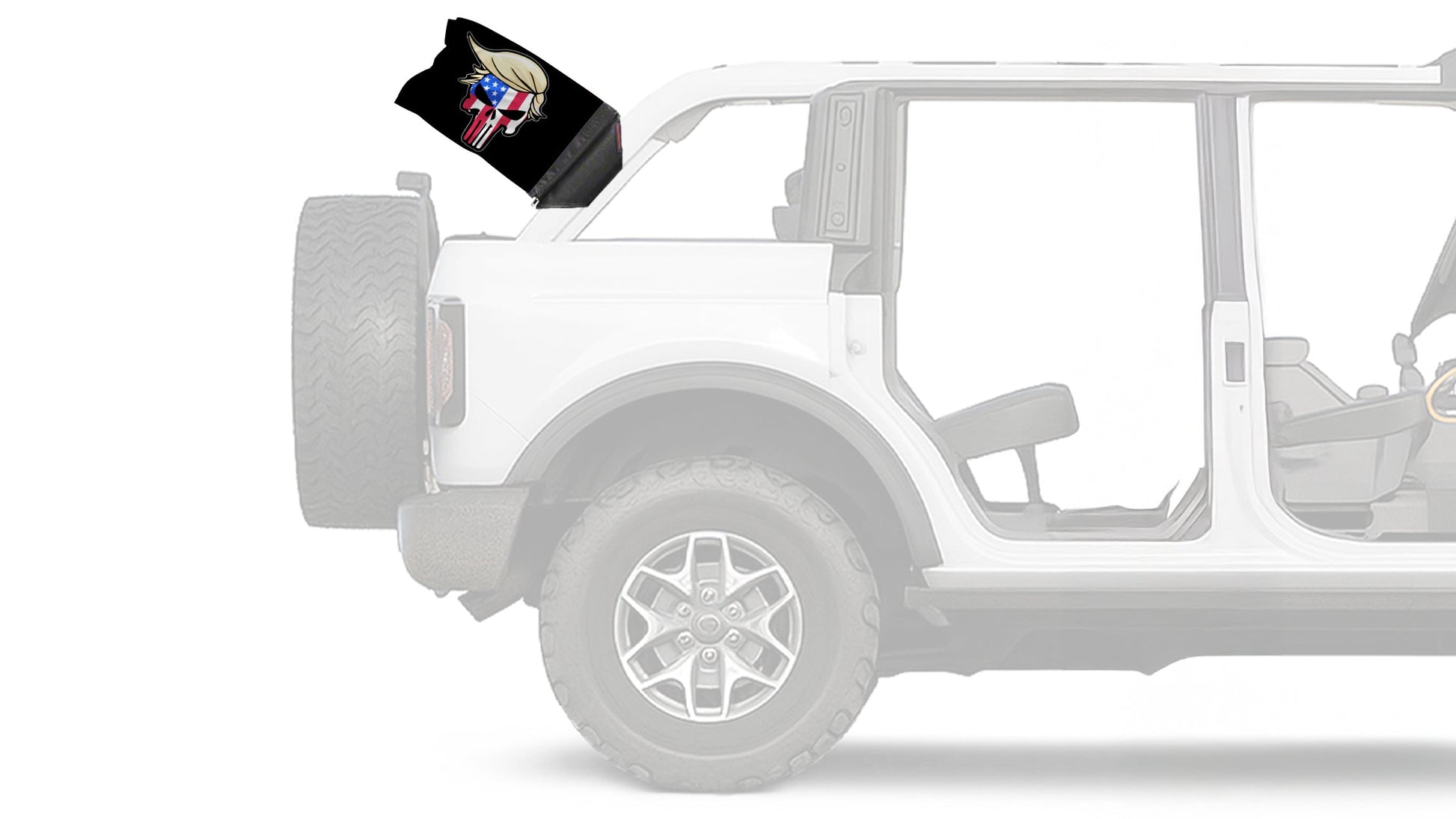 Show your style on every ride with the Trump Punisher 12"x18" Forever Wave Flag for Bronco, proudly Made in the USA and designed to work exclusively with the Forever Wave interchangeable Flag for Bronco sleeve system. Built from premium, UV-resistant polyester, this durable double-sided Flag for Bronco is engineered to withstand sun, wind, rain, and off-road conditions while maintaining bold, vibrant color.