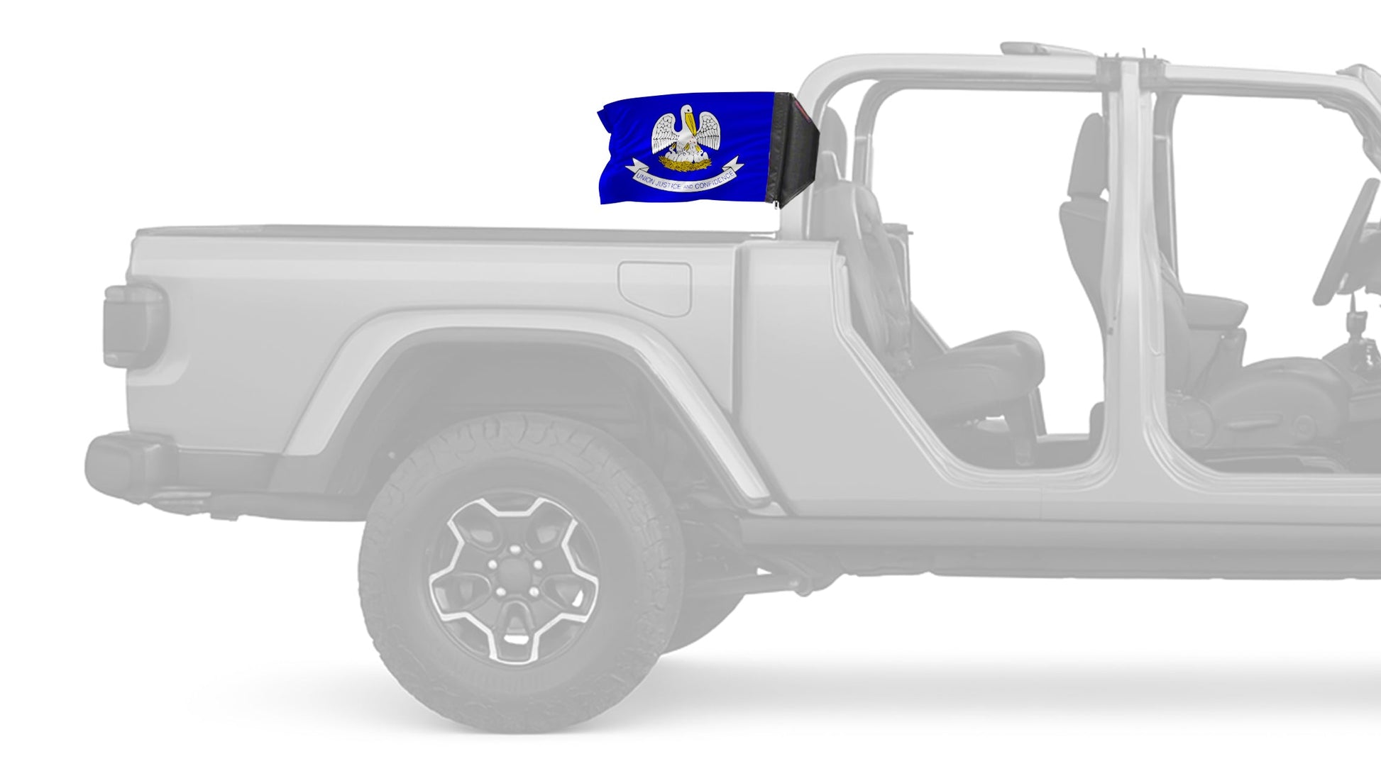 Show your style on every ride with the State Of Louisiana 12"x18" Forever Wave Flag for Jeep Gladiator JT, proudly Made in the USA and designed to work exclusively with the Forever Wave interchangeable flag sleeve system. Built from premium, UV-resistant polyester, this durable double-sided flag is engineered to withstand sun, wind, rain, and off-road conditions while maintaining bold, vibrant color.