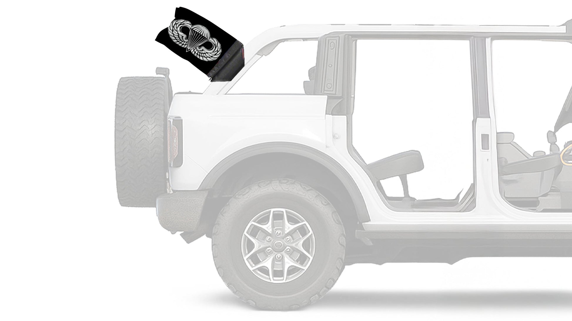 Show your style on every ride with the Airborne 12"x18" Forever Wave Flag for Bronco, proudly Made in the USA and designed to work exclusively with the Forever Wave interchangeable Flag for Bronco sleeve system. Built from premium, UV-resistant polyester, this durable double-sided Flag for Bronco is engineered to withstand sun, wind, rain, and off-road conditions while maintaining bold, vibrant color.